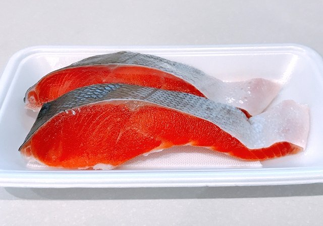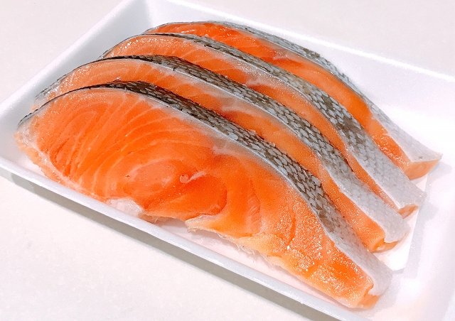 • 銀鮭:魚体自体が大きく、養殖で丸々と太っているため、切り身も「厚切り」で断面が広いことが多いです。脂の層(白い筋)がくっきりと見えます。