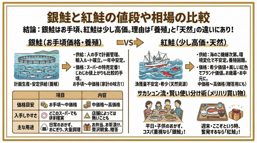 結論から言うと、一般的には「銀鮭の方がお手頃」で、「紅鮭の方が少し高価」という傾向があります。もちろん時期や漁獲量にもよりますが、これには明確な理由があるんです。
