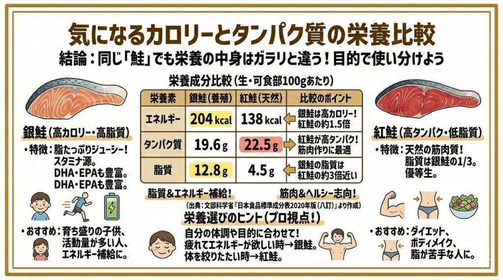 栄養素銀鮭(養殖)紅鮭(天然)比較のポイント