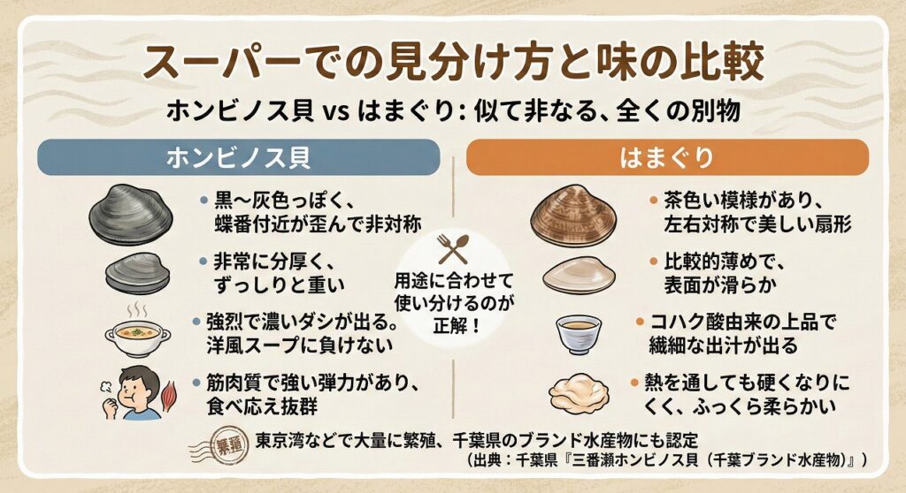 味と食感の面でも明確な違いがあります。はまぐりは繊細で上品な旨味(コハク酸)があり、加熱してもふっくらと柔らかいのが魅力。対するホンビノス貝は、筋肉質で噛みごたえのある強い弾力と、強烈でパンチのある濃いダシが出るのが最大の違いです。用途に合わせて使い分けるのが正解かなと思います。