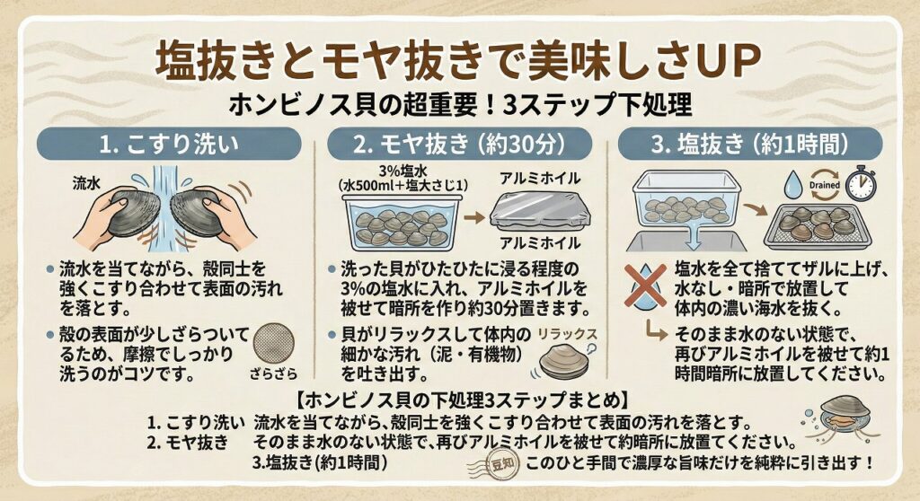 ホンビノス貝は大量の砂こそ吸い込んでいませんが、生息環境の性質上、微細な泥や有機物(通称:モヤ)を体内に保持していることがよくあります。また、彼らは体内に非常に濃度の高い海水をたっぷりと溜め込む性質を持っています。この「モヤ」と「濃い塩水」をしっかり抜いてあげないと、スープや酒蒸しにしたときに強烈な塩味と雑味が出てしまい、料理全体の味覚バランスが完全に崩壊してしまいます。