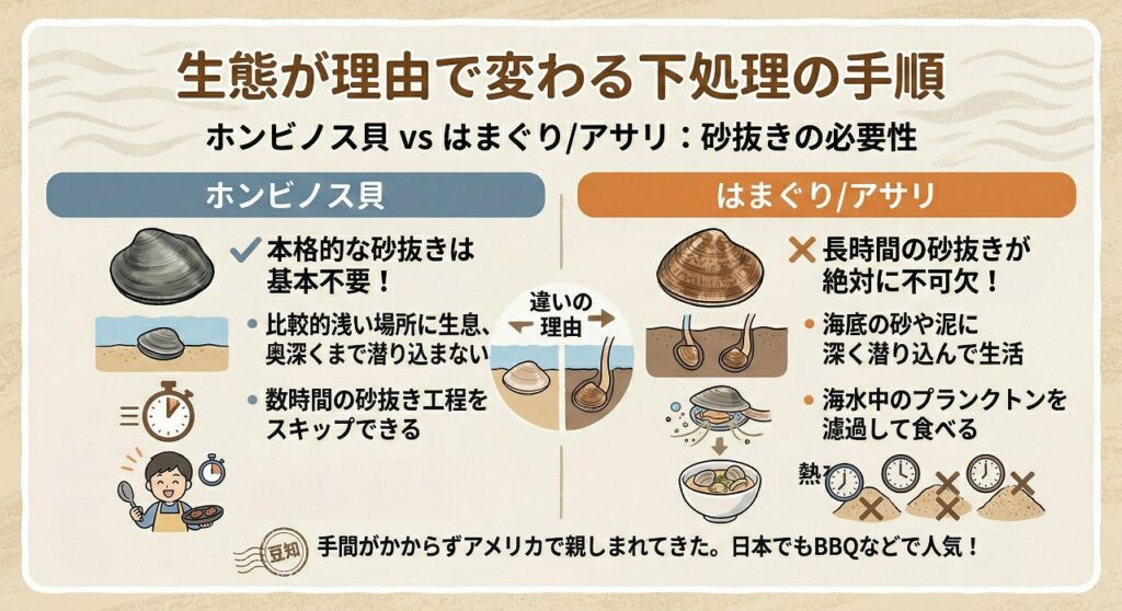 一方で、ホンビノス貝はどうでしょうか。彼らも砂泥地に生息してはいるのですが、はまぐりのように砂の奥深くまで潜り込んで生活する性質が弱く、比較的浅い場所にいることが多いんです。そのため、体内にジャリジャリとした大量の砂を溜め込むことが生態的に少ないんですね。これが「ホンビノス貝は砂抜き不要」と言われる最大の科学的理由です。
