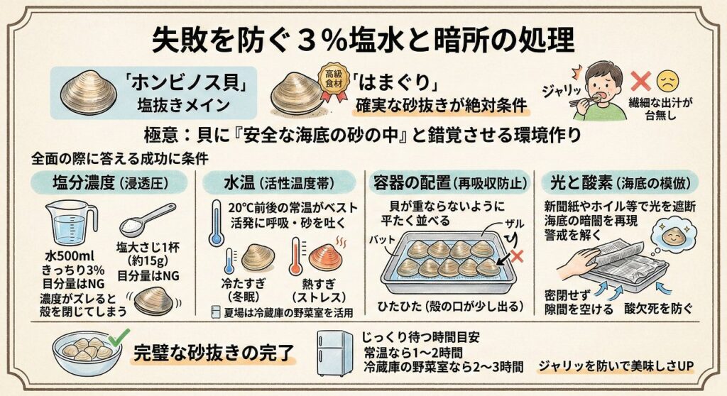 まず一番重要なのが「塩分濃度」の厳格な管理です。海水と全く同じ「3%」が絶対の基準値となります。目分量ではなく、計量カップと計量スプーンを使って「水500mlに対して塩大さじ1杯(約15g)」をしっかり量って溶かしてください。塩分が薄すぎても濃すぎても、はまぐりは異常を察知して殻を固く閉ざしてしまい、一切砂を吐かなくなってしまいます。