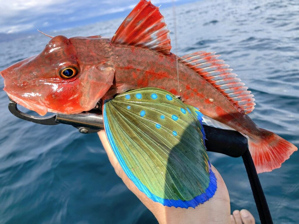 ホウボウの最大の特徴は、翼のように大きく広がる美しい胸ビレです。この胸ビレは鮮やかな青緑色で、青い縁取りと斑点に彩られており、敵を威嚇する際などに使われると考えられています。