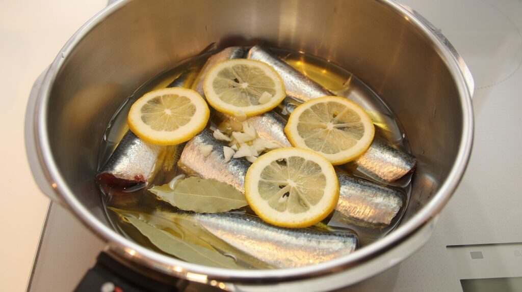 圧力鍋に下処理をしたイワシを並べ入れます。そこへ、水、にんにく、レモン、ローリエ、オリーブオイル(大さじ3)、味付け用の塩を加えます。