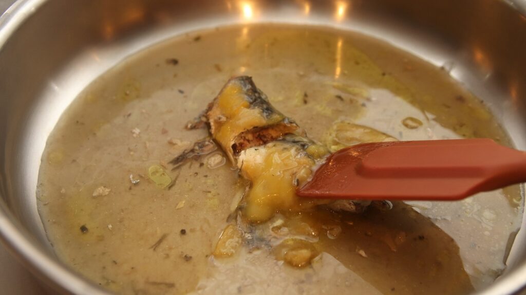 - 究極のパスタソースになる煮汁: 大量の油で煮るコンフィと違い、水と少量のオイルで煮込むため、イワシの旨味が溶け出した「煮汁」を後で極上のソースとして余すことなく再利用できます。