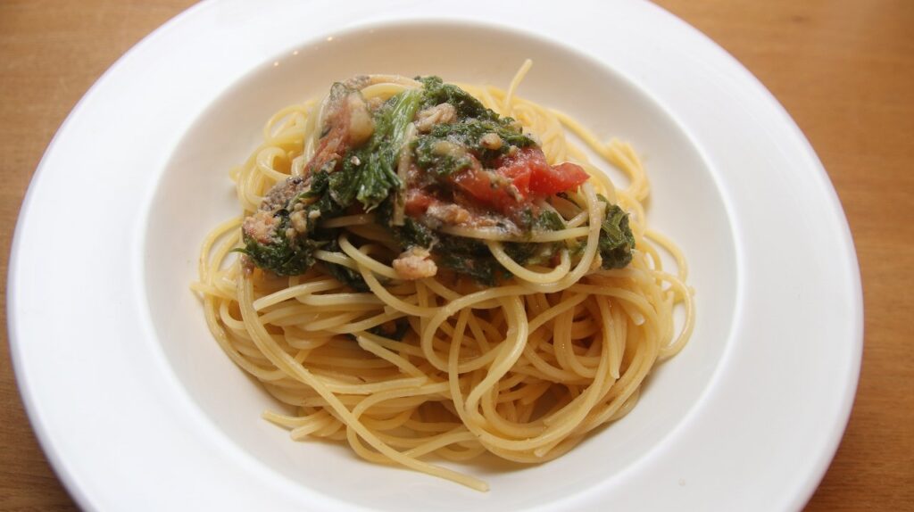 この煮汁にはすでに「にんにく」と「オリーブオイル」が入っているので、茹でたてのパスタと崩したイワシの身を絡めるだけで、最高に美味しい絶品パスタが完成します。