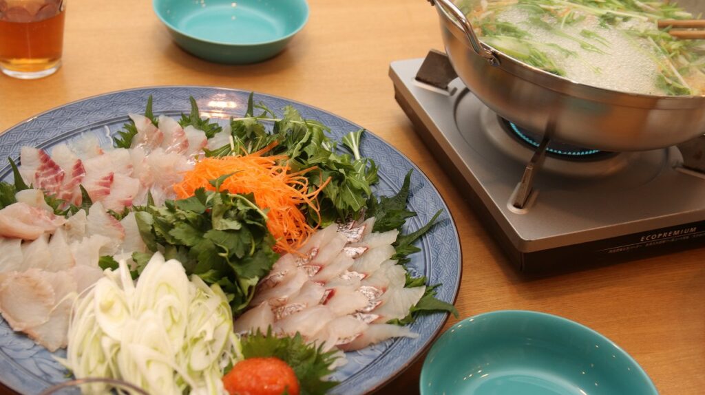 真鯛のお刺身で「松皮造り(皮目に熱湯をかけて湯引きしたもの)」という食べ方がありますが、このしゃぶしゃぶという行為そのものが、鍋の中で湯引きを行っているのと同じ状態になります。