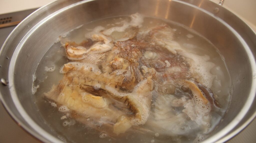 焼いたアラを先ほどの昆布出汁の鍋に入れ、強火にかけます。沸騰したら中火にして10分ほど煮出します。
