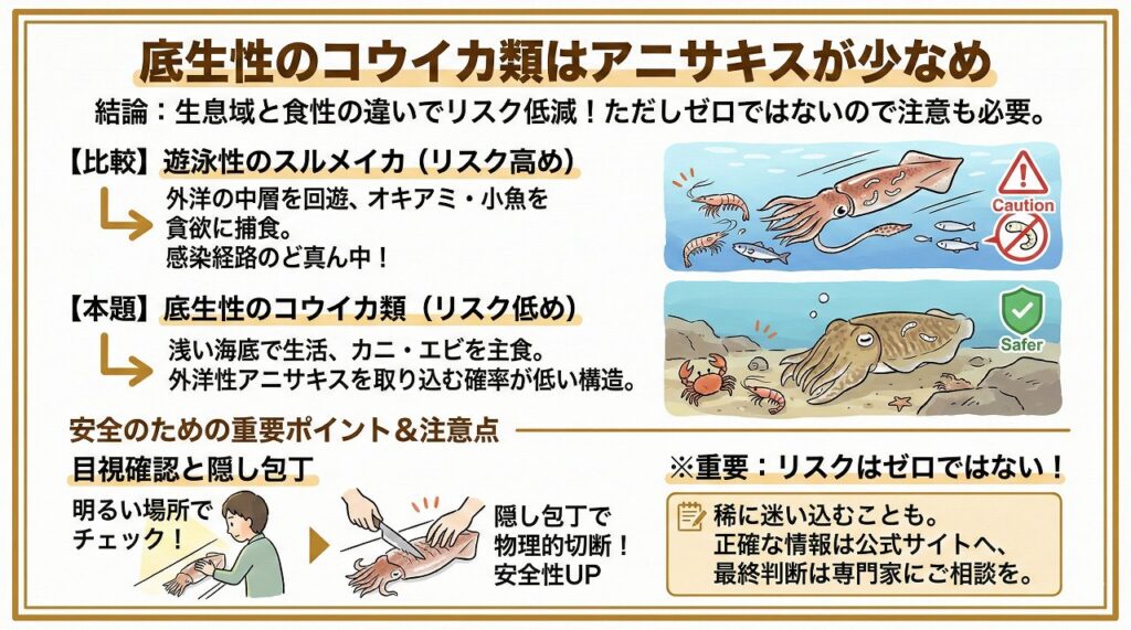 スルメイカは外洋の中層を大群で猛スピードで泳ぎ回り、アニサキスを持ったオキアミや小魚を貪欲にバクバク食べるため、感染経路のど真ん中にいます。一方で、コウイカ類は水深の浅い海底付近でじっと身を潜めて暮らす「底生性」の生き物です。海底を這い回るカニやエビなどを主食としているため、外洋性のアニサキスを体内に取り込む確率が自然と低くなる構造になっているんです。