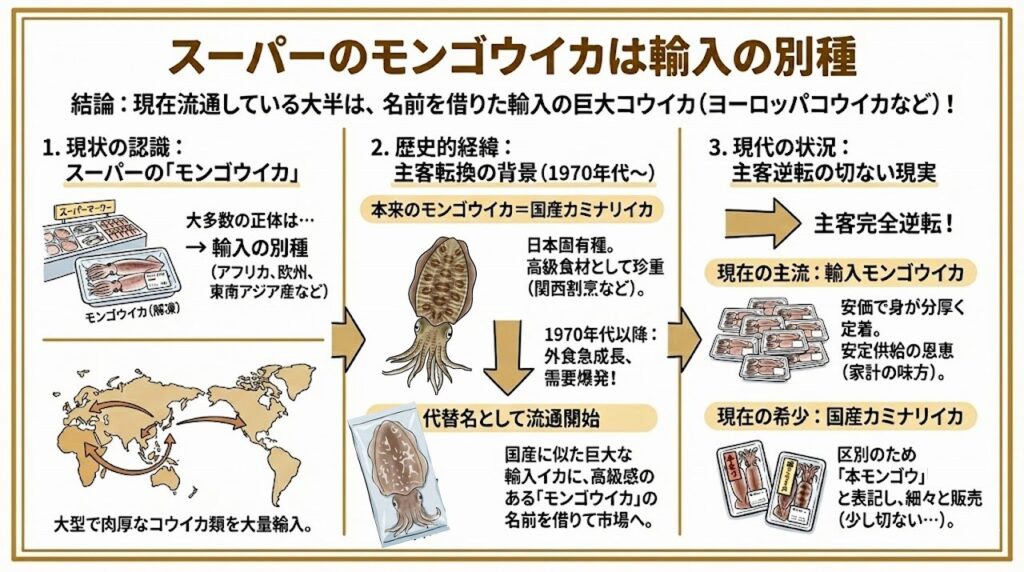 需要を満たすため、水産会社は海外の海から、日本のカミナリイカに似た巨大なコウイカの仲間を大量に輸入するようになりました。これらの輸入イカは胴体の長さが30センチを超えるほど巨大で、肉厚な点がカミナリイカにそっくりでした。そこで、消費者に親しみを持ってもらうために、かつてからあった「モンゴウイカ」という高級感のある名前を借りて(代替名として)市場に流通させたのです。その結果、安価で身が分厚い「輸入モンゴウイカ」が一般社会に完全に定着してしまいました。