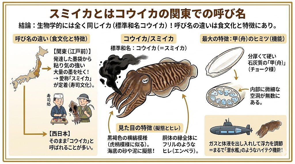- スミイカとコウイカは呼び方が違うだけで実は同じイカであること