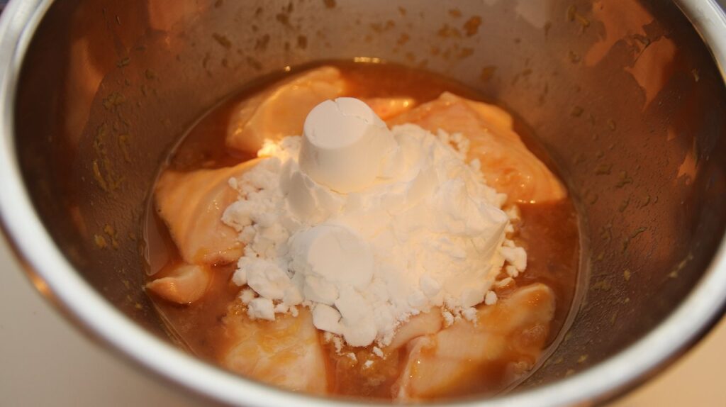 寝かせ終わったら、いよいよ片栗粉(大さじ4)を投入します。