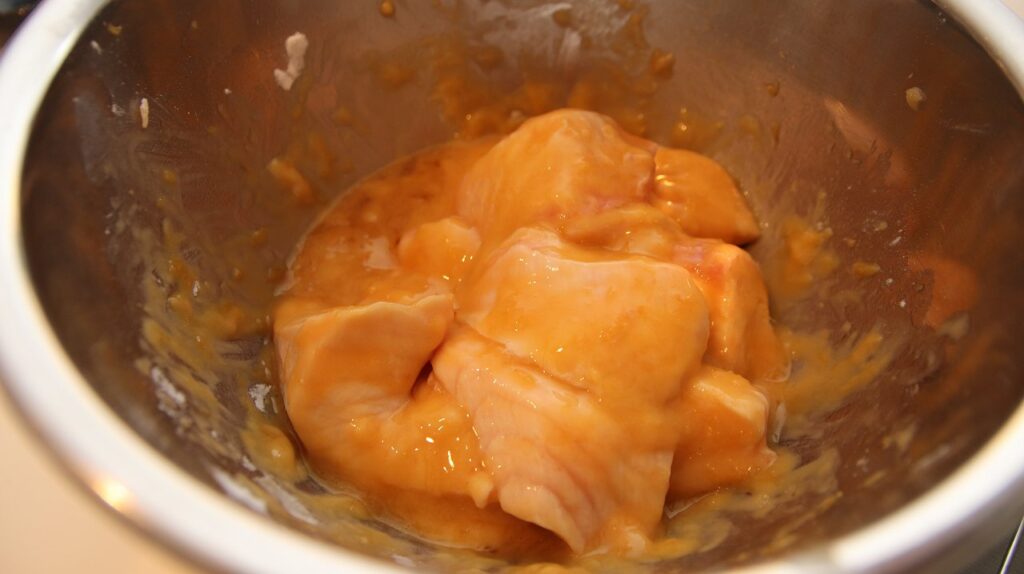 そこに片栗粉「以外」の材料(醤油、塩、みりん、生姜、卵)をすべて加え、手でよく揉み込みます。