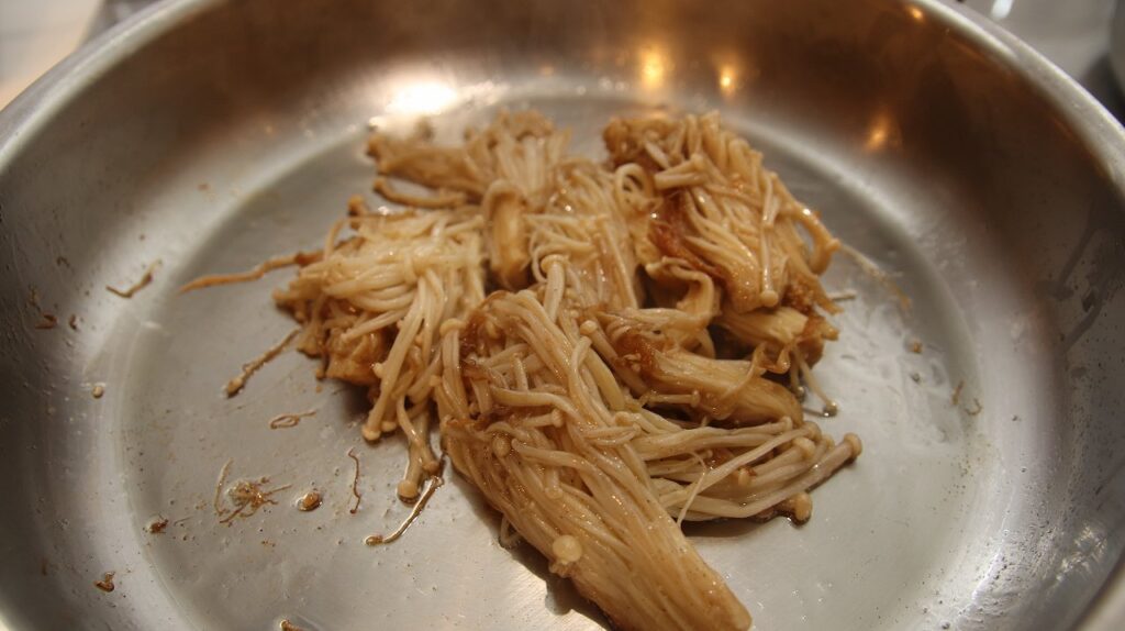 フライパンにオリーブオイルを熱し、えのきを入れて塩コショウを振り、しんなりするまで炒めます。一度お皿に取り出しておきましょう。