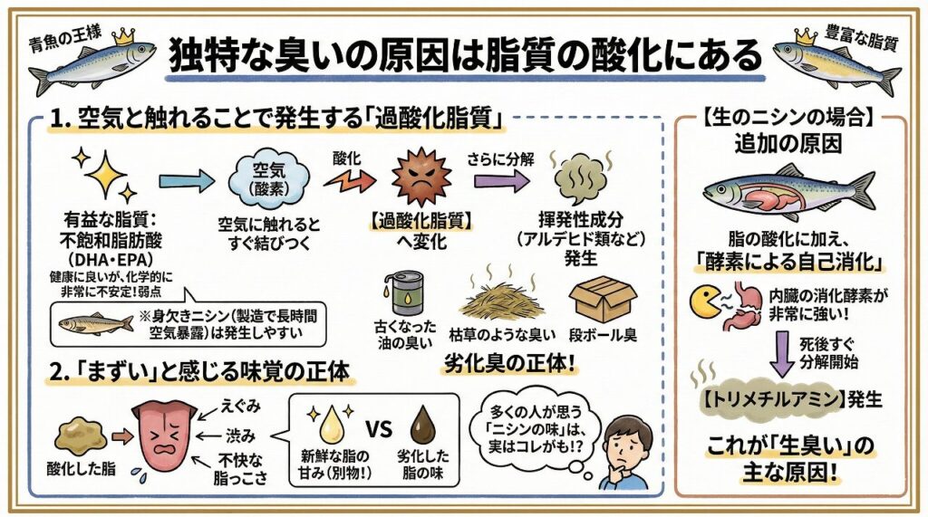 生のニシンの場合は、脂の酸化に加えて「酵素による自己消化」が臭いの原因になります。ニシンは内臓の消化酵素が非常に強く、死後すぐに内臓から分解が始まり、トリメチルアミンという生臭さ成分を発生させます。これが「生臭い」と言われる主な原因です。