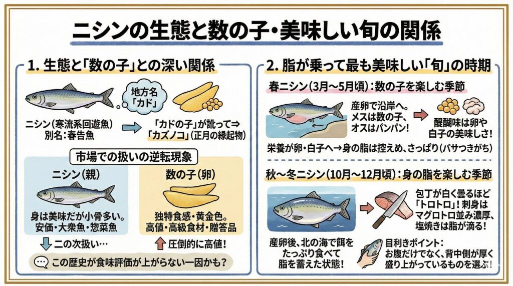 「ニシンはパサパサしていて美味しくない」と思っている方は、もしかしたら食べる時期(旬)を間違えているかもしれません。ニシンを美味しく食べるためには、「春ニシン」と「秋ニシン」の違いを理解することが極めて重要です。