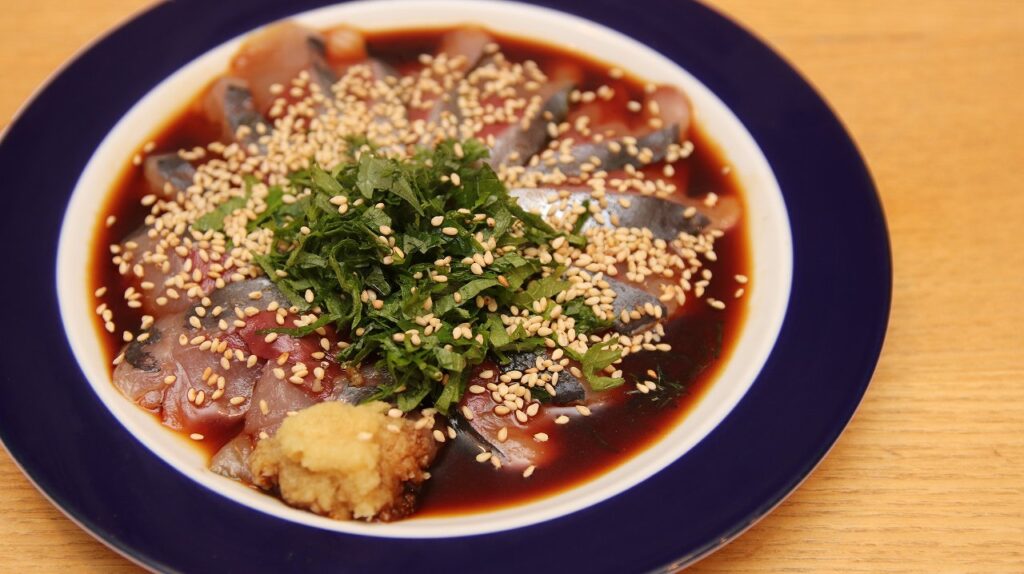 今回試した中で、最高に美味しかったのが「博多のゴマサバ風」です。 作り方は簡単。醤油とみりんを1:1で煮詰めて冷まし、福岡の甘い醤油風タレを作ります。これを刺身にしたオアカムロにたっぷりかけ、すりごまを振るだけ。