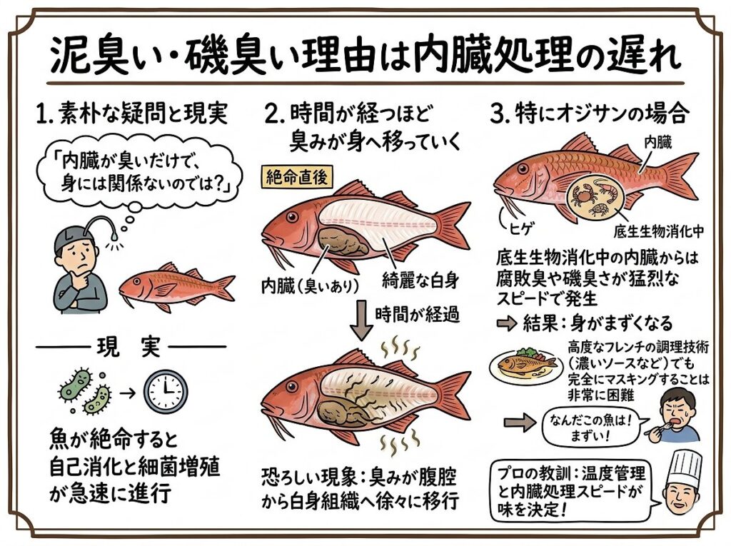 一度でも身に臭いが移り込んでしまうと、そこからいくら丁寧に洗おうが、高度なフレンチの調理技術を用いて濃いソースでマスキングしようが、完全に臭いをごまかすことは非常に困難になってしまいます。結果として、それを食べた人が「なんだこの魚は!泥臭くて磯臭くて、とても食べられたものじゃない、まずい!」と誤った評価を下してしまうのです。