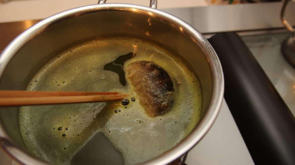 「青ナマコは柔らかくて食べやすいけど、独特の泥っぽい匂いがちょっと苦手…」という方や、「赤ナマコをもらったけど、硬すぎて歯が立たない!」という方に試してほしいのが、プロの技「茶ぶり(ちゃぶり)」です。