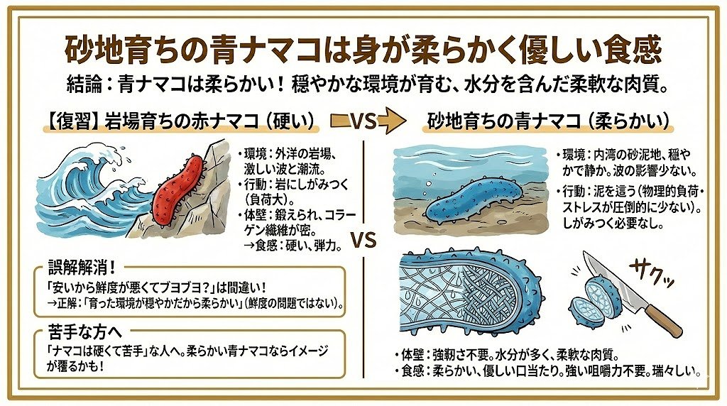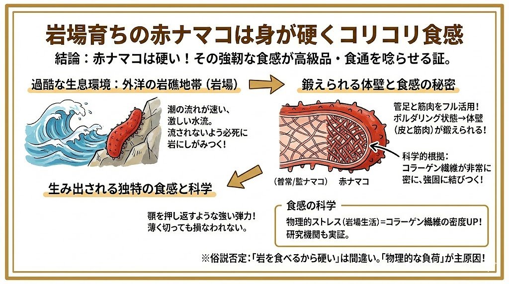 ナマコの食感の違いは「コラーゲン繊維の密度」によるものです。物理的ストレスのかかる岩場に住む赤ナマコほど繊維が密になり、硬さが増すことが水産研究機関の調査でも明らかになっています。