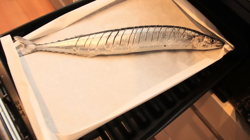 グリルをしっかりと5分以上予熱してからサンマを入れ、まずは片面を7〜8分じっくり焼きます。