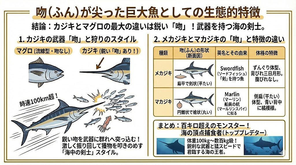 さらに、カジキ類の中でも「メカジキ」と「マカジキ」には、この吻の形に決定的な違いがあります。ここを知っておくと、水族館や図鑑で見るのがもっと楽しくなりますよ。