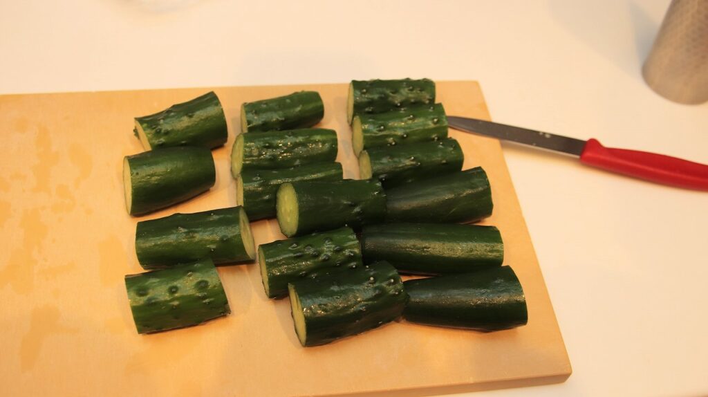 キュウリを洗い、ヘタを落としてから3〜4等分にカットします。