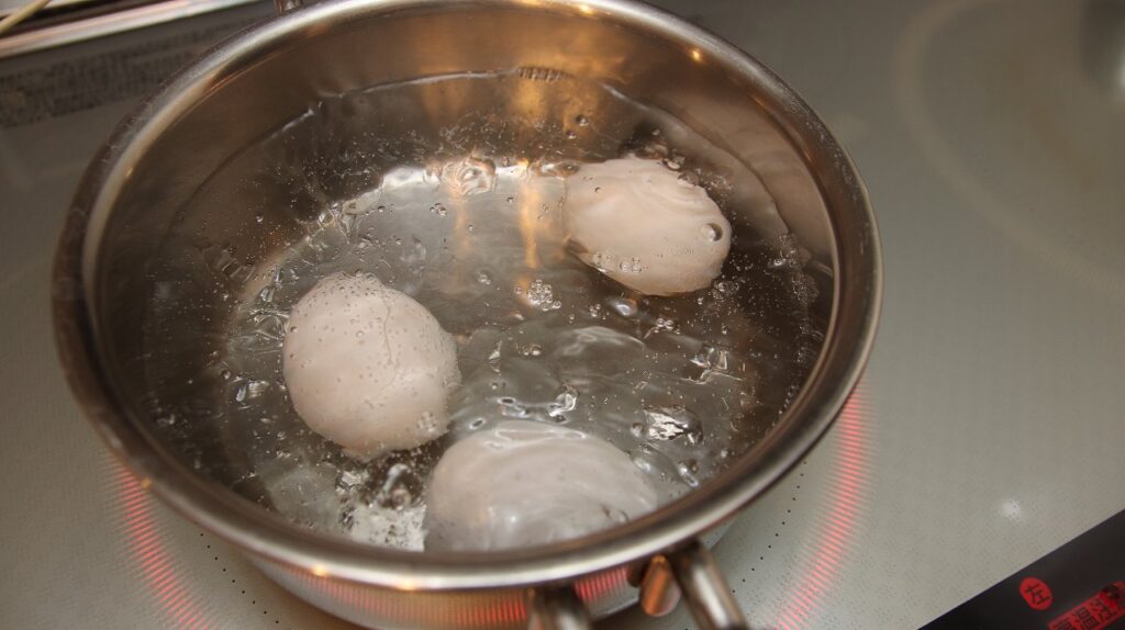 まず、卵を固ゆで(沸騰してから約12分)にします。
