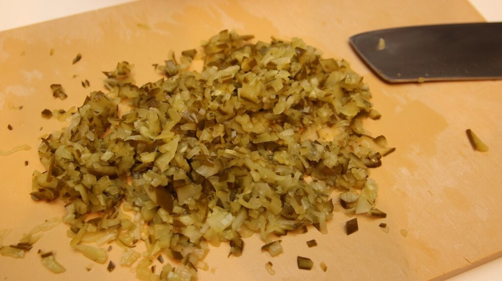 自家製ピクルスを1本分(4カット)取り出し、みじん切りにします。 食感を残したいので、粗すぎず、細かすぎずの中間くらいがおすすめです。