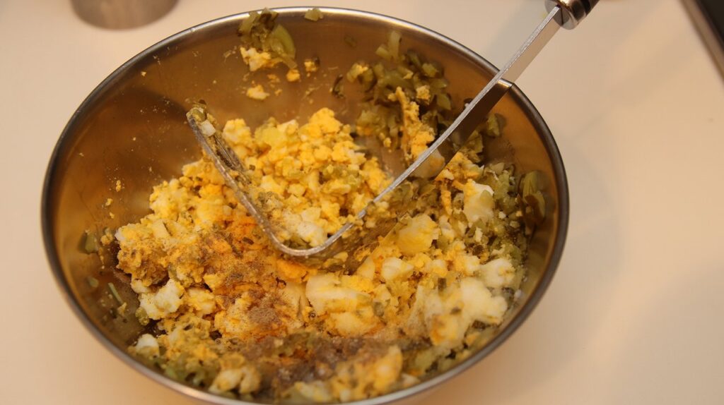 潰したゆで卵のボウルに、みじん切りにしたピクルス、塩コショウ少々、マヨネーズ大さじ4を入れます。 あとは、全体が均一になるまでスプーンなどでよく混ぜるだけ!