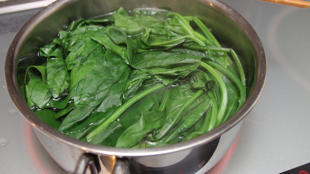 ほうれん草と里芋は、あらかじめ下茹でしておきます。
