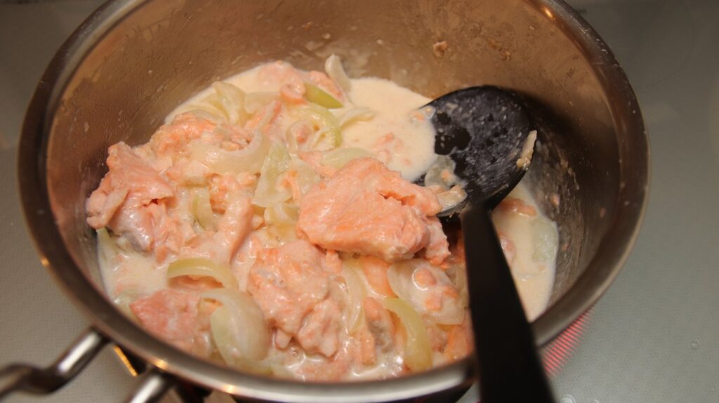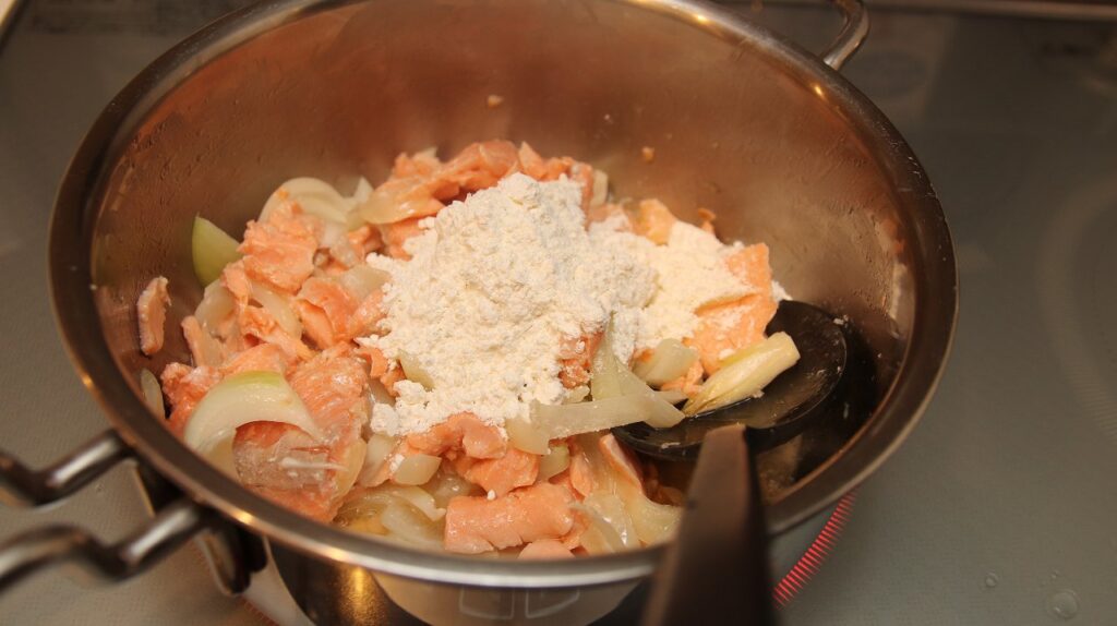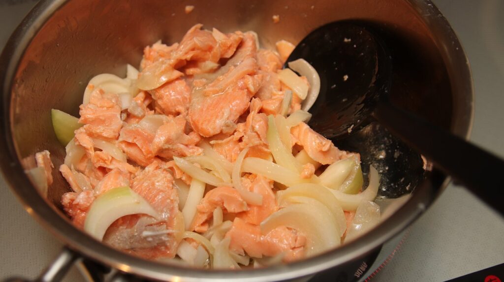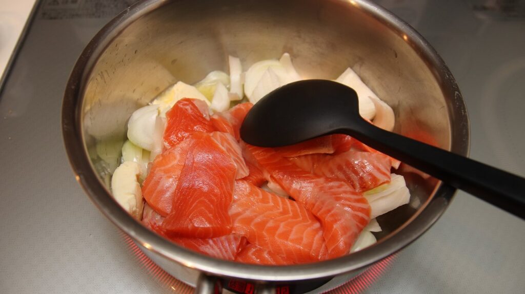 玉ねぎがしんなりとして、サーモンの表面の色が変わるまで炒めます。