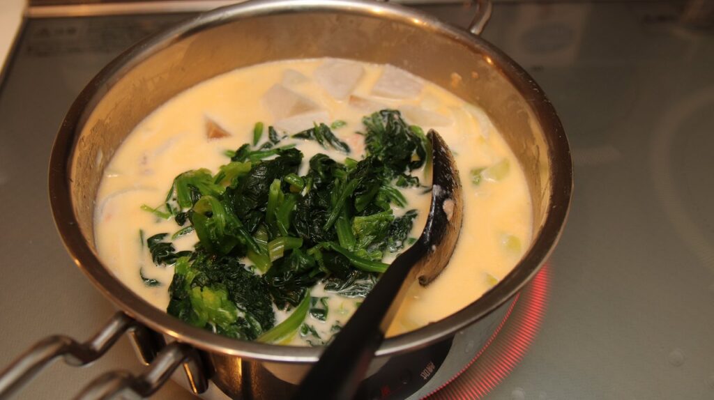 最後に、下茹でしておいた里芋とほうれん草を加えます。