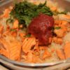 玉ねぎがしんなりとして、サーモンの表面の色が変わるまで炒めます。