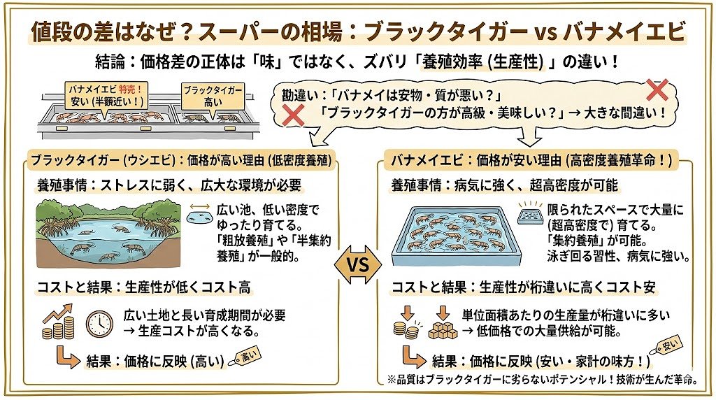 スーパーで価格を見ると、ほぼ間違いなく「バナメイエビ」の方が安く、「ブラックタイガー」の方が高く設定されています。特売日にはバナメイエビがブラックタイガーの半額近い値段で売られていることも珍しくありません。これを見ると、「バナメイは安物で質が悪いのでは?」「ブラックタイガーの方が高級で美味しいに決まっている」と勘違いしてしまいそうですが、それは大きな間違いです。