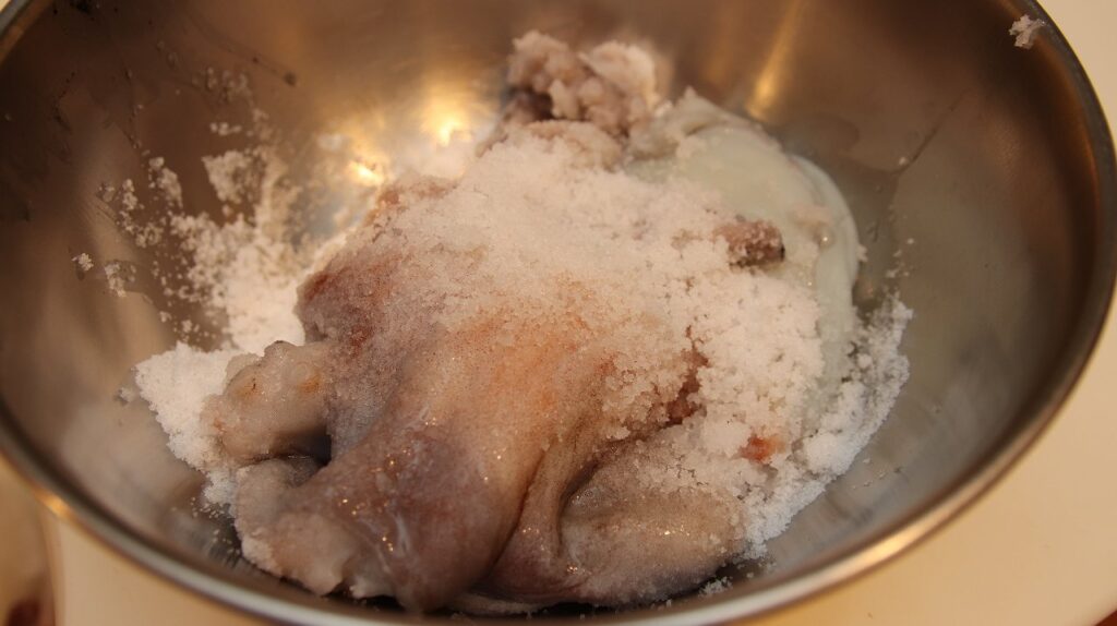 手順4:繰り返す もう一度ボウルに戻し、新しい塩を振って同じように揉み込みます。これを2〜3回繰り返しましょう。指でタコの表面を触って、「ヌルッ」ではなく「キュッキュッ」という音が出るくらい滑らなくなれば完了です!