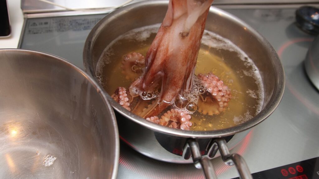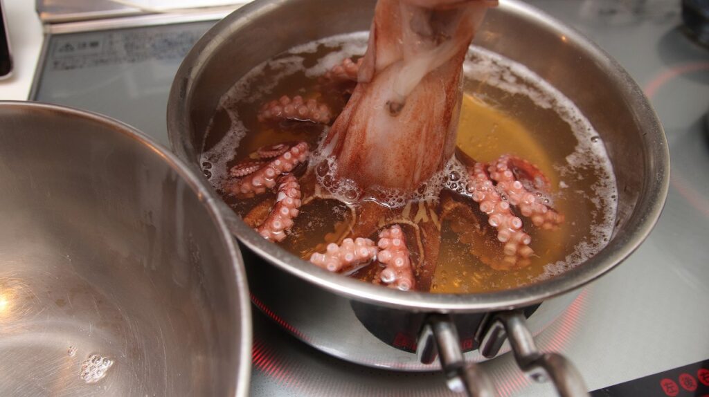写真のようにタコの頭を持ち、足先だけを熱湯に「チョン、チョン」と数回つけたり上げたりを繰り返します。こうすると、熱いお湯に反応して足先がくるくると外側に綺麗に丸まっていきます。