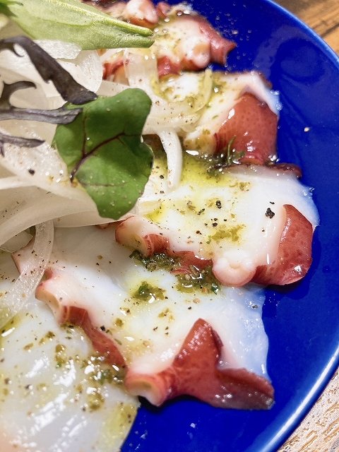 まず、お刺身(タコぶつ)。マダコの魅力はなんといっても、あのコリコリとした食感と、噛むほどに溢れ出る強い旨味です。薄切りにしたカルパッチョでも、マダコならペラペラにならず、しっかりとした存在感を主張してくれます。わさび醤油やオリーブオイルに負けない力強い味わいは、マダコならではのものです。