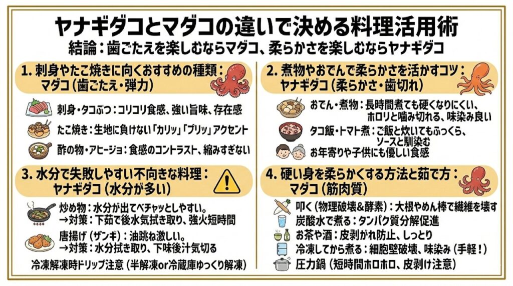 ここまでで、マダコとヤナギダコの性質の違いはバッチリ理解できたと思います。ここからは実践編として、「じゃあ、この料理を作る時はどっちを選べばいいの?」という疑問に、具体的なメニューを挙げながらお答えします。結論を一言で言えば、「歯ごたえを楽しむならマダコ、柔らかさを楽しむならヤナギダコ」です。