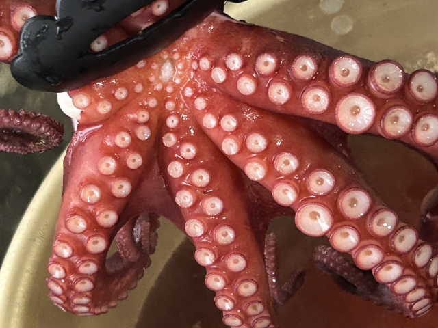 - 大根で叩く: 昔ながらの職人の知恵です。大根(または瓶の底やめん棒など)でタコの足をバンバンと叩きます。こうすることで筋肉の繊維が物理的に壊れ、さらに大根に含まれる酵素(ジアスターゼ)がタンパク質を分解して柔らかくしてくれます。